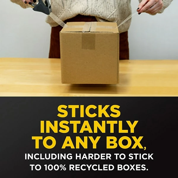 Scotch Box Lock Packaging Tape sticks instantly to any box! It has the power of extreme grip to ensure boxes stay securely sealed, even during rough handling. Its new advanced adhesive creates a secure seal over box edges, and its thickness and durability reduces splitting and tearing and makes it easier to find the start of the roll. This tape can be used to seal any type of box, including harder-to-stick to 100% recycled boxes.